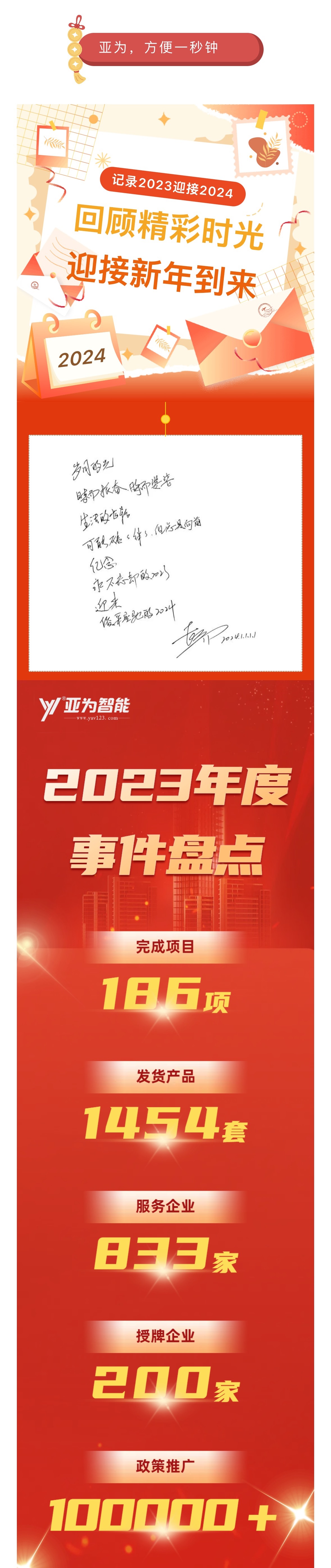 2023這一年,亞為“旗幟飛揚”,我們東到一望無際的東海,西到長河落日的新疆克拉瑪依,北到大漠孤煙的內(nèi)蒙古,南到煙波浩渺的三亞,縱橫8000公里,亞為人累計行蹤超25萬公里,組織、服務(wù)或保障各類活動310余場次,為全國的數(shù)字化發(fā)展,發(fā)出了亞為的聲音,貢獻了亞為的力量。